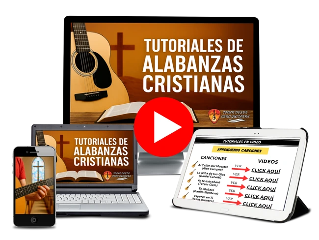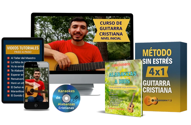 Todo lo que necesitas para tocar alabanzas en guitarra: curso fácil, canciones guiadas y pistas de acompañamiento.